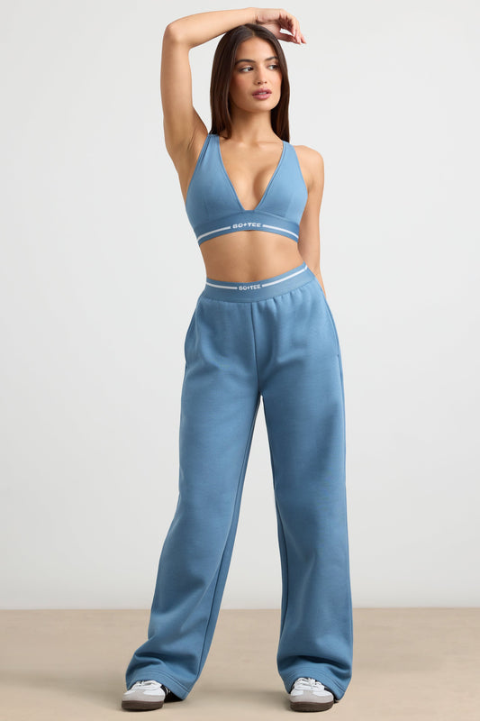 Stretch Cotton Jersey Backless Turtleneck Long-Sleeve Crop Top in Steel Blue
