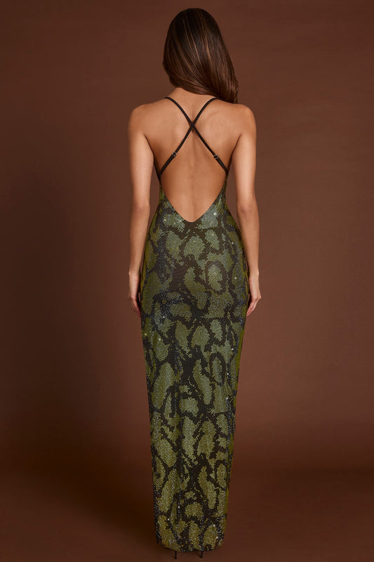 Embellished Bandeau Gathered Maxi Dress in Snake Hotfix