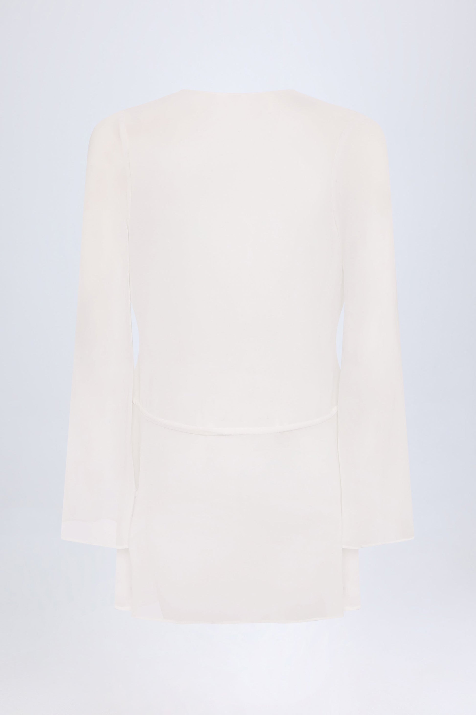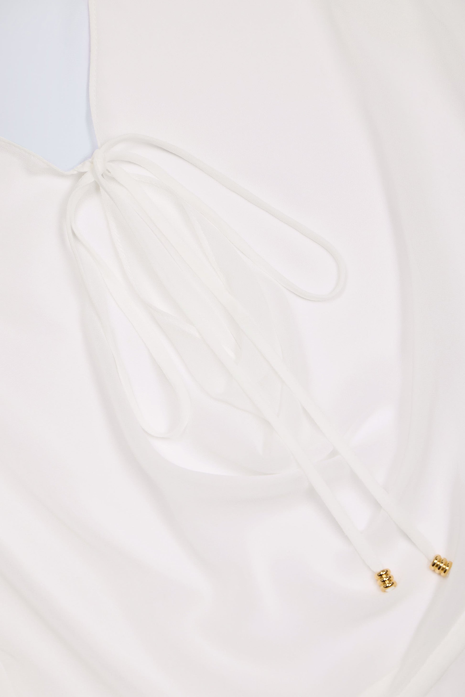 Perfect for poolside pictures and beachside bar-hopping, the Oualie mini dress is crafted from premium, lightweight and sheer chiffon to spotlight your favourite swimwear. It’s cut to a breezy silhouette framed with a cowl neckline and adjustable ruching at the hip so you can adjust it to your perfect length. It’s complete with long flared sleeves and adjustable ties at the front tipped with gold-tone beads.