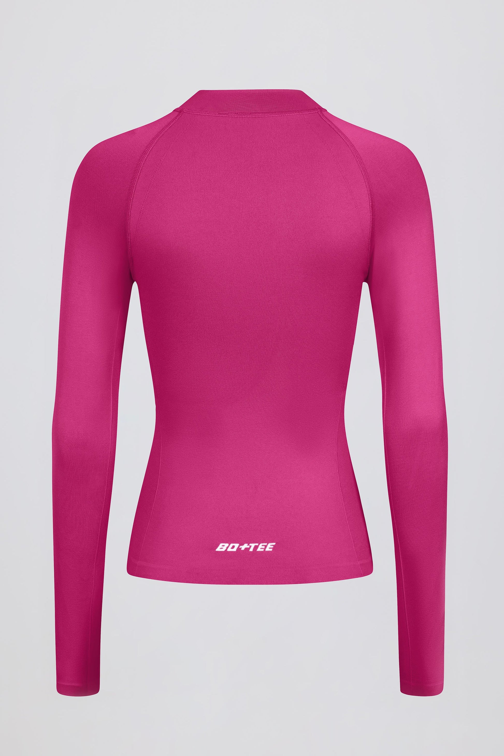 Functional comfort. Made from our breathable, moisture-wicking and lightweight Define Luxe fabric, this jacket is perfect for everyday workouts, outdoor activities and running errands. Designed for a second-skin fit, it features underbust contouring and compressive ribbed panels along each side, creating a sculpted look. It has a high collared neckline for extra protection against the elements and a signature Bo+Tee logo at the back.