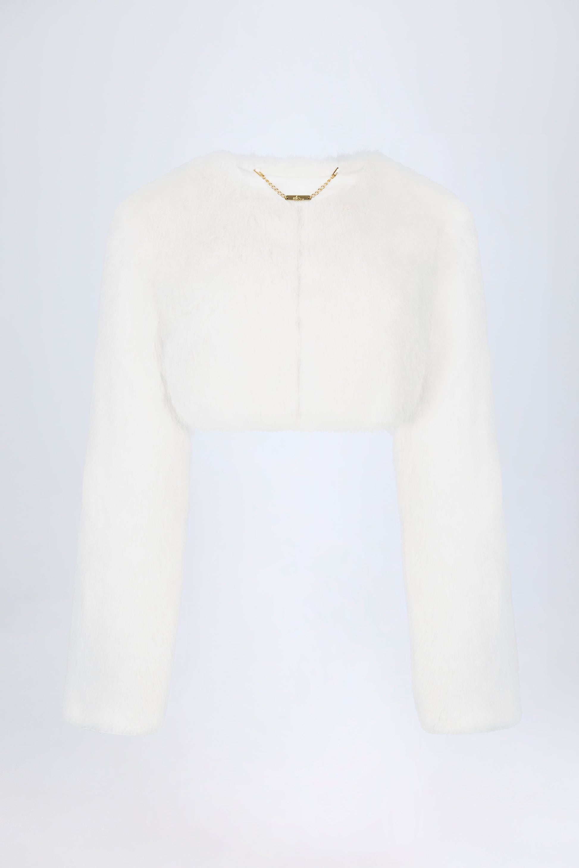 Glam layering made effortless. The Almerinda bolero is crafted from premium faux mink and cut to a cropped length for maximum impact. It features a classic round neckline, wide sleeves, and a delicate hook-and-eye front fastening for a flawless finish. Perfect for draping over your most glamorous looks.
