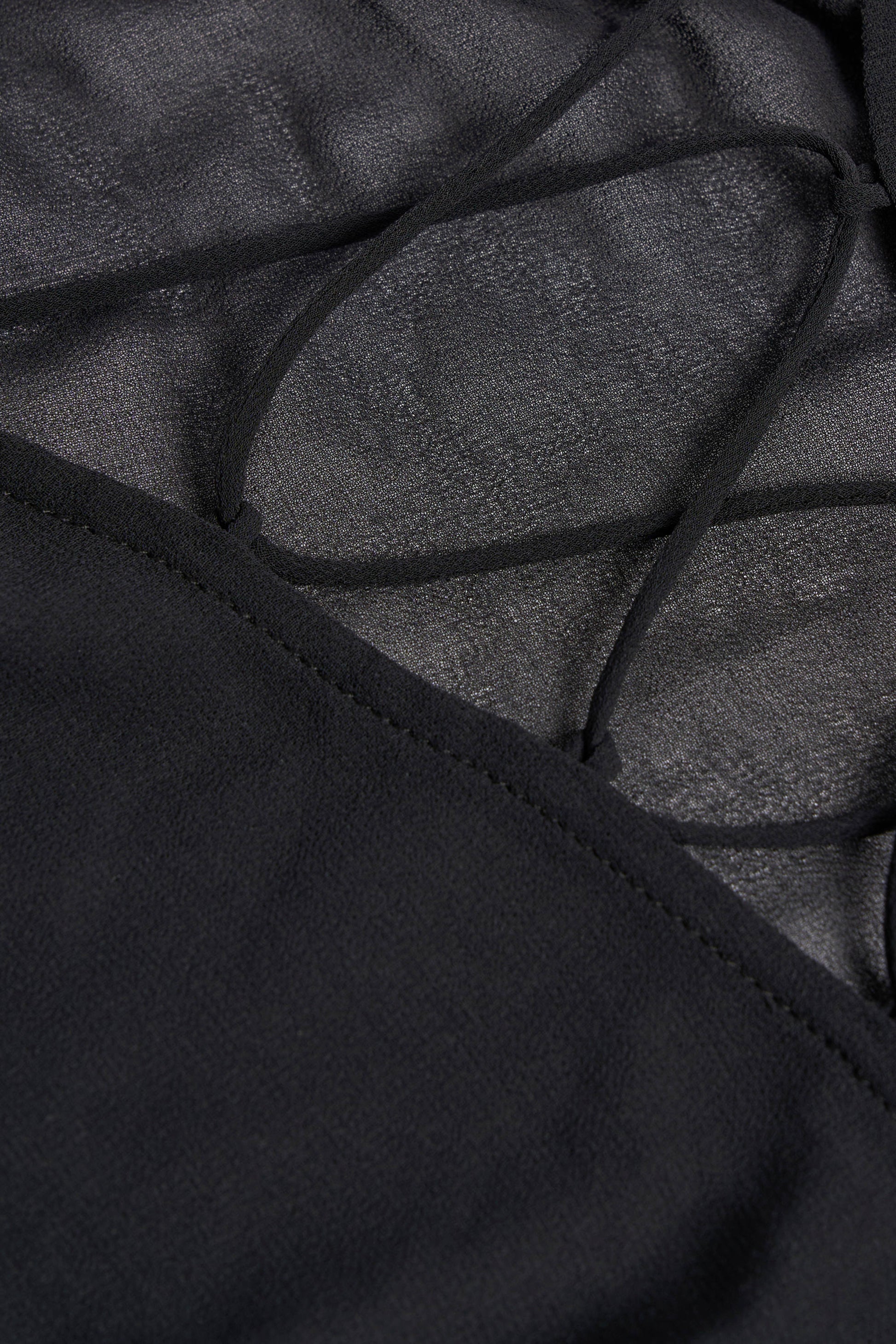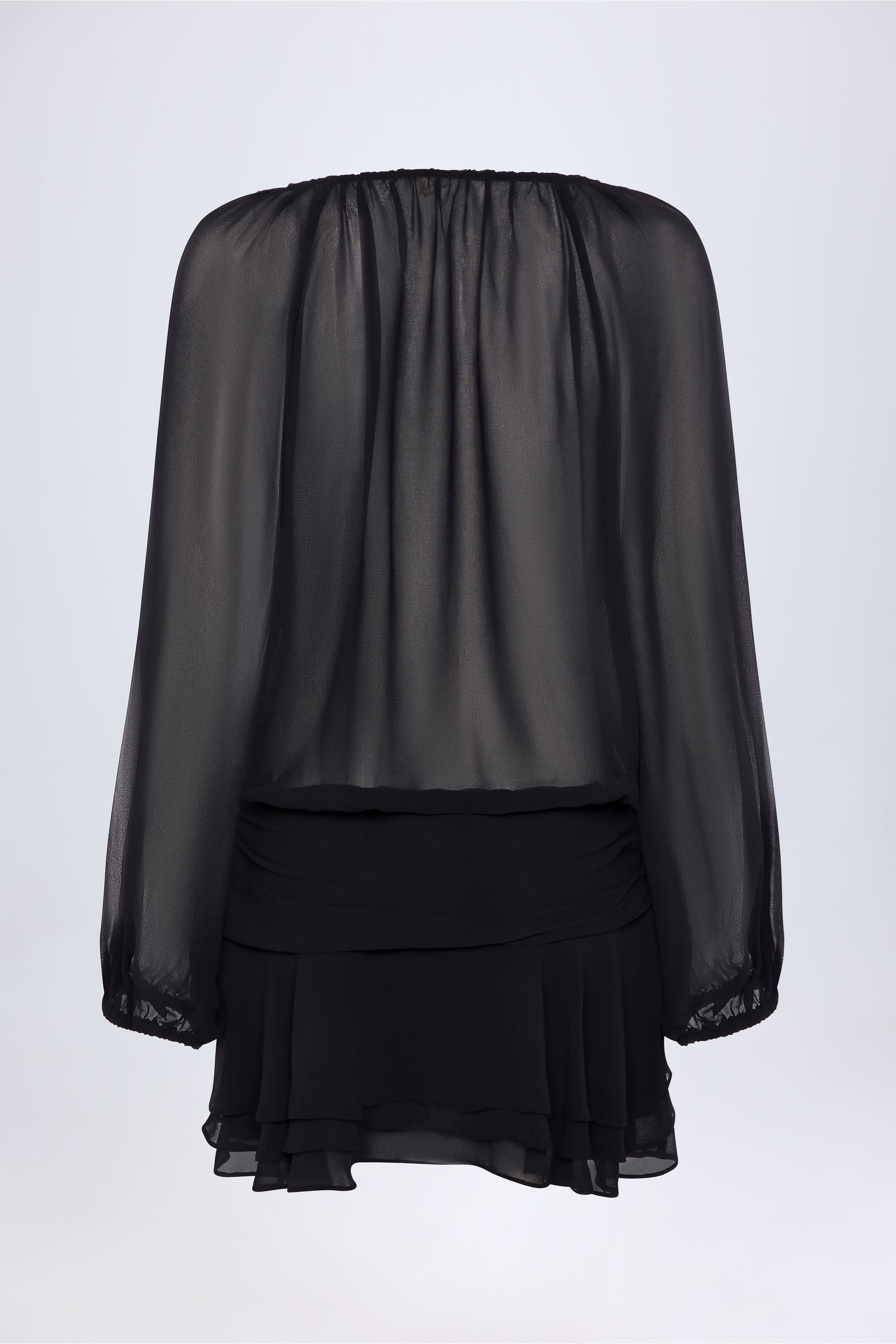 For the dreamers and all-day dancers, the Avalon mini dress is crafted from premium, lightweight georgette. It’s cut to a relaxed silhouette with a semi-sheer loose bodice, framed with oversized balloon sleeves and features a layered mini skirt. It’s complete with a plunge neckline anchored with functional lace-up ties for custom coverage.