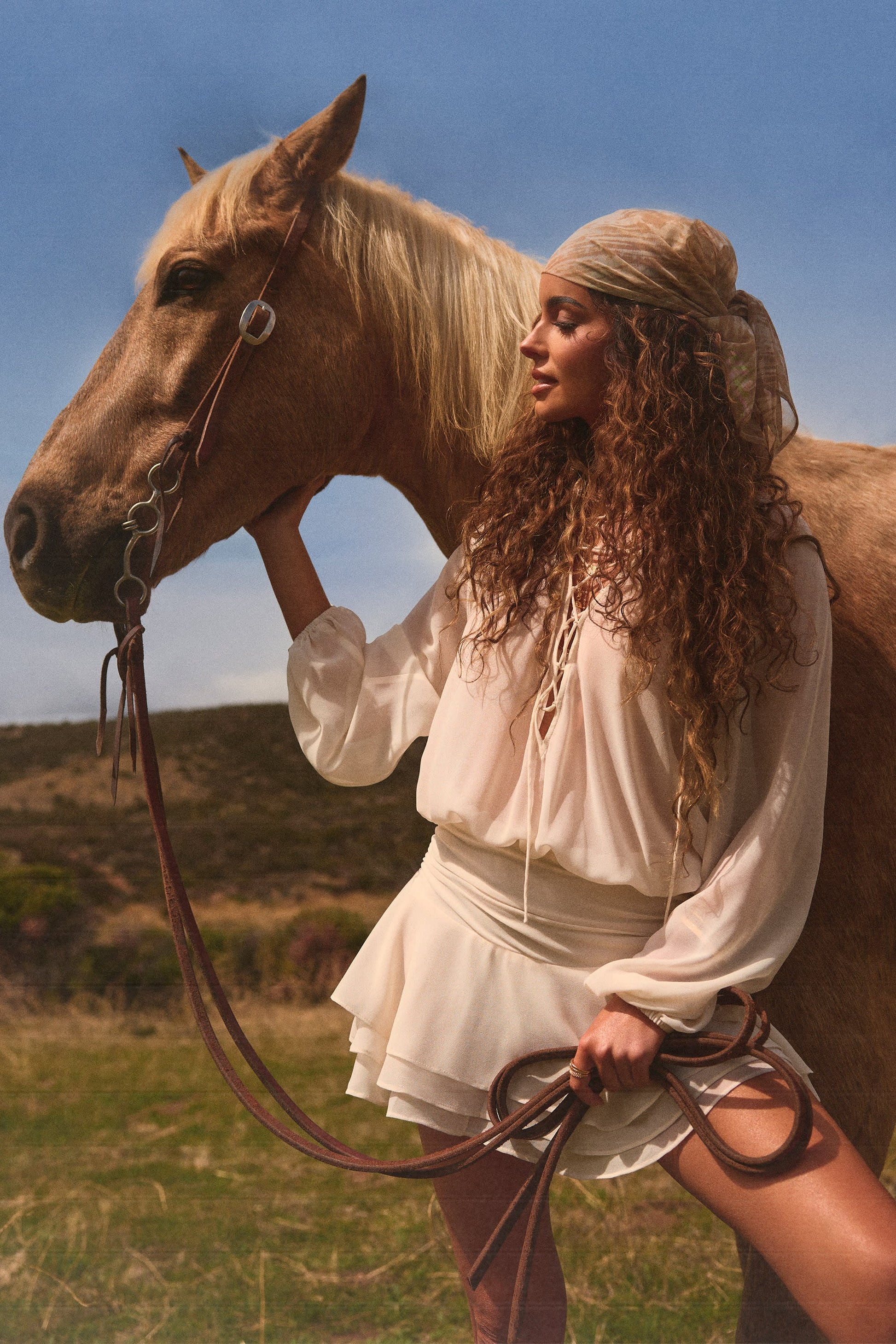 For the dreamers and all-day dancers, the Avalon mini dress is crafted from premium, lightweight georgette. It’s cut to a relaxed silhouette with a semi-sheer loose bodice, framed with oversized balloon sleeves and features a layered mini skirt. It’s complete with a plunge neckline anchored with functional lace-up ties for custom coverage.