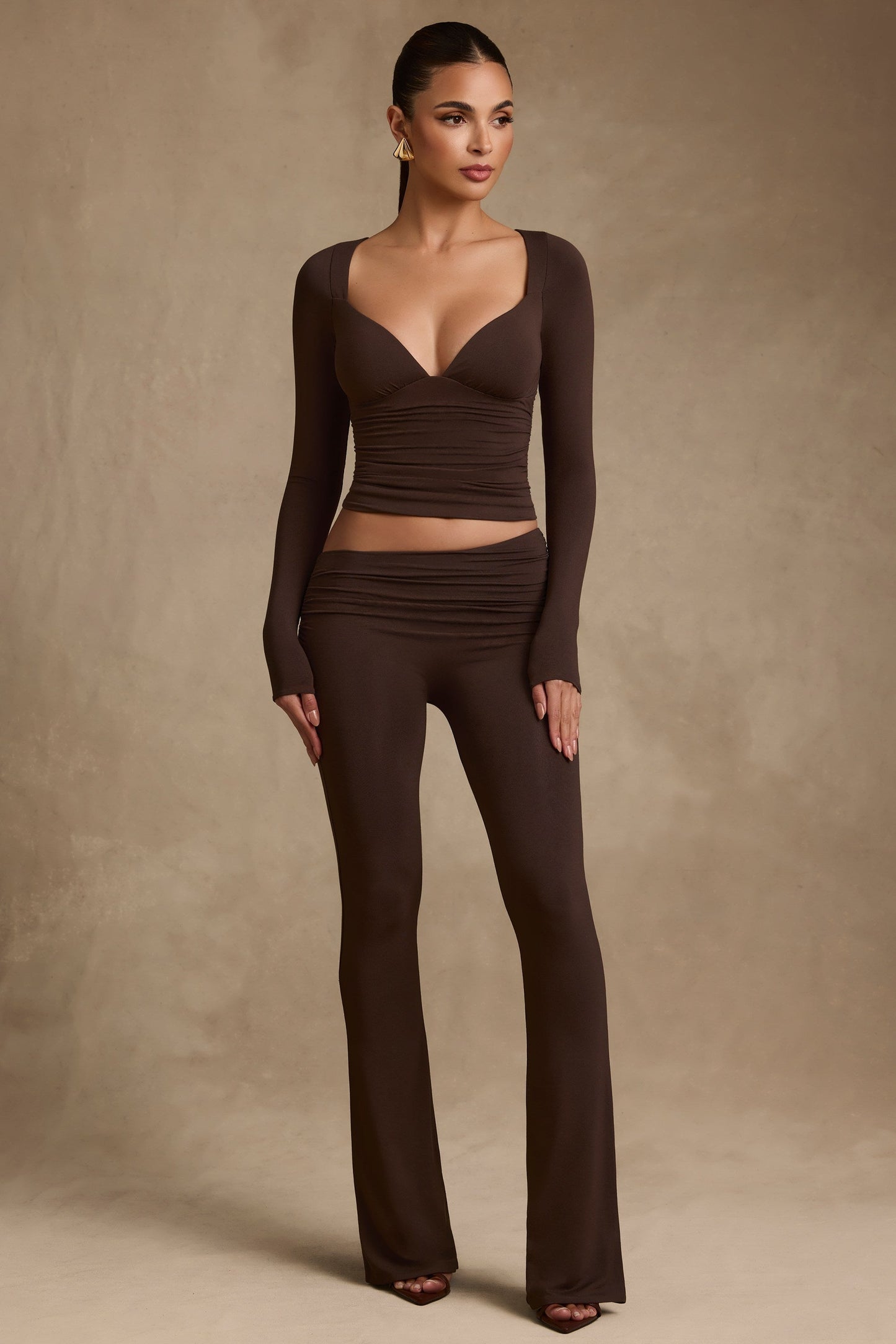 Modal Asymmetric-Waist Flared Trousers in Chocolate Brown