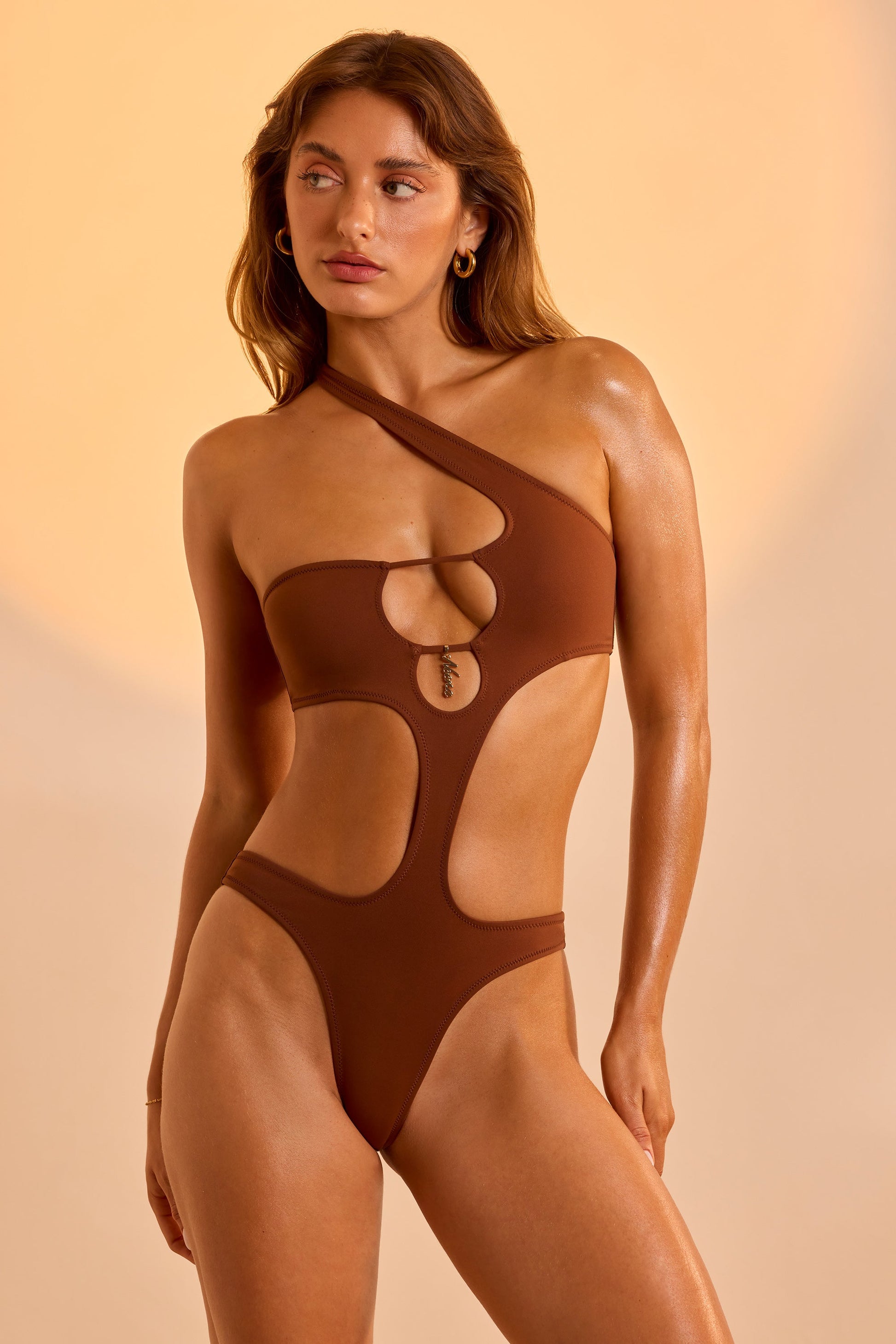 Swim on by and catch eyes doing it. Made in our premium stretchy nylon fabric, the sexy Signature Swim II one-piece swimsuit features an adjustable asymmetrical design, with a high leg cut and cheeky back coverage. With statement cut-out accents and hardware Neena Swim charm detailing, stand out on beach shores, boat trips and wherever else your vacation takes you.