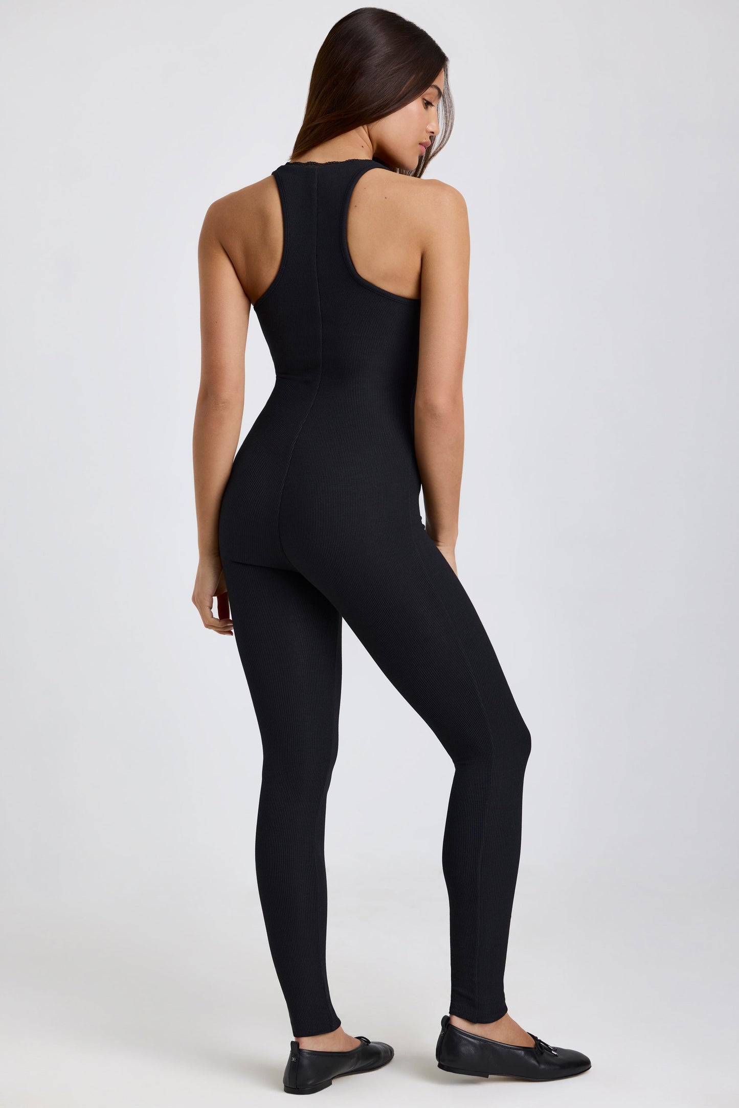 Petite Ribbed Modal Lace-Trim Jumpsuit in Black