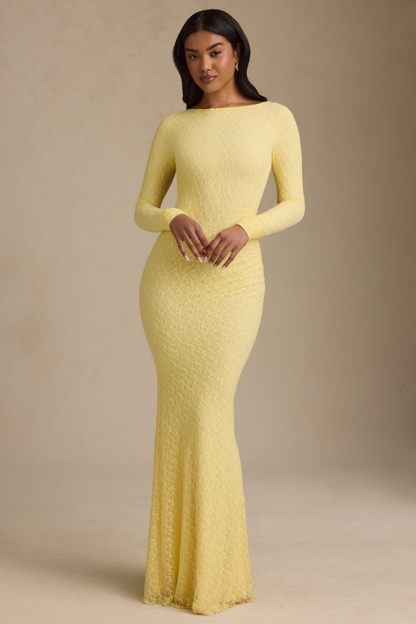 Ruched Backless Lace Maxi Dress in Pastel Yellow