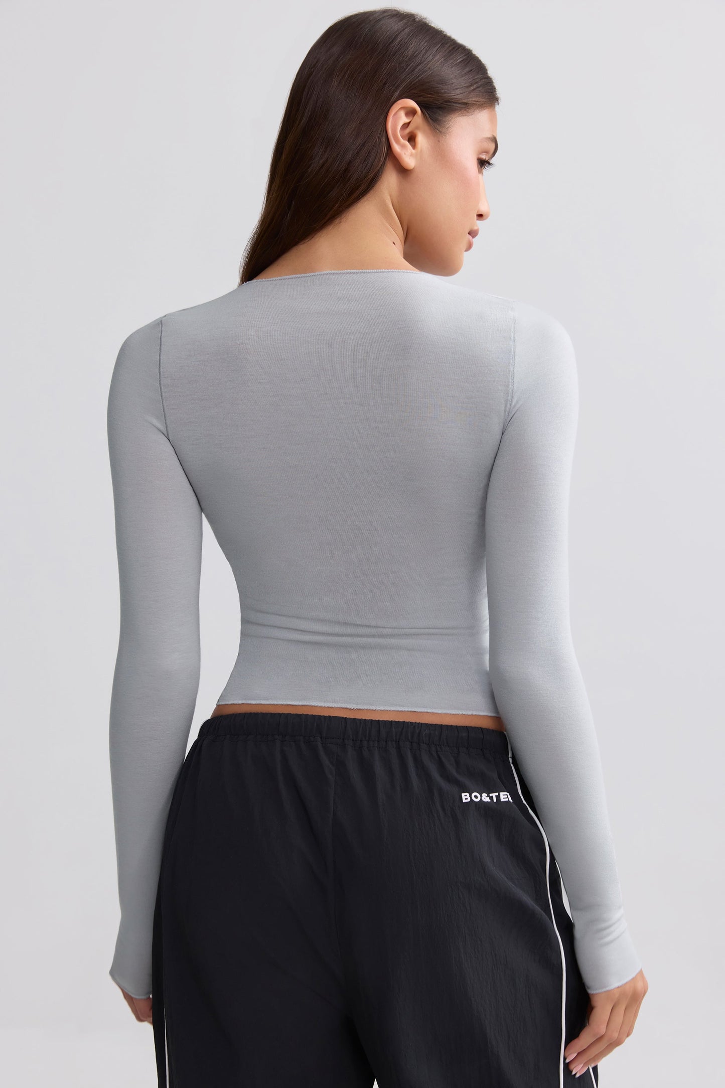 Easy layering essentials. Available in two neutral hues and ideal for styling atop a tonal sports bra for an elevated athleisure look, this long-sleeve crop top is crafted from a lightweight sheer jersey fabric. The high round-neck silhouette, cuffs and hem are finished with exposed overlock stitching.