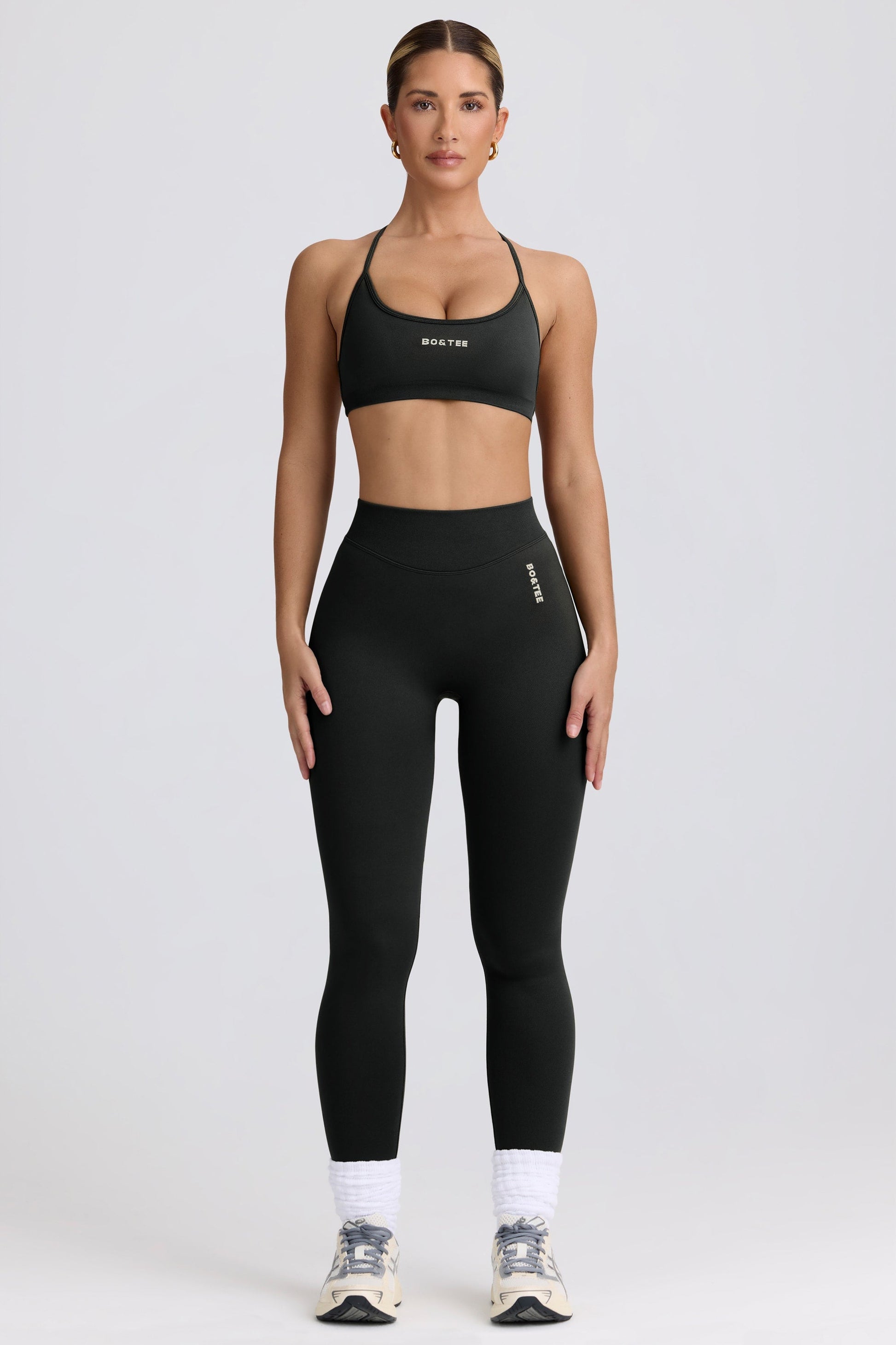 • High-waist compressive dipped waistband